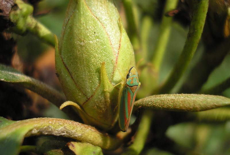 Her sidst på foråret, hvor sommeren venter lige rundt om hjørnet, er jeg taget på haveinspektion i rhododendronbedet. Formålet er at få et glimt af en lille fin cikade. Endnu er den ikke større end et par millimeter og dens grønne farve falder godt i med de stedsegrønne blade, så der skal holdes fokus. Endnu er det nemlig kun nymferne der ses. Nemmere bliver det om en måneds tid når den voksne cikade slår sine folder i planterne. Den er omkring 1 cm lang og med sine smukke farver er den noget nemmere at få øje på. Jeg har dog ikke held med at finde nogle af de små grønne nymfer, men jeg bor også den nordlige del af landet, hvor den ikke er så almindelig endnu. Anderledes ser det ud jo længere mod øst man kommer.