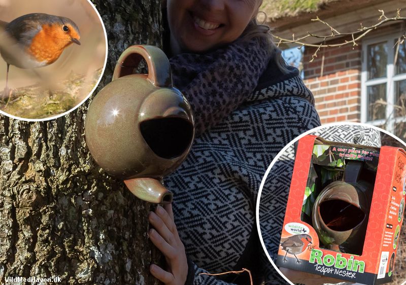 Ideen kommer fra England, hvor firmaet Wildlife World oprindelig fandt på at udforme en tepotte som redekasse – primært til rødhalsen, men rødstjert, vipstjert og flere andre fugle bruger den også gerne. Tekanden er lidt sjov fordi man kigger lige en ekstra gang når der hænger en tekande på muren, plankeværket eller træet. Jeg kan godt lide de små events og oplevelser når jeg bevæger mig rundt i haven. Der må gerne være noget at se på.
