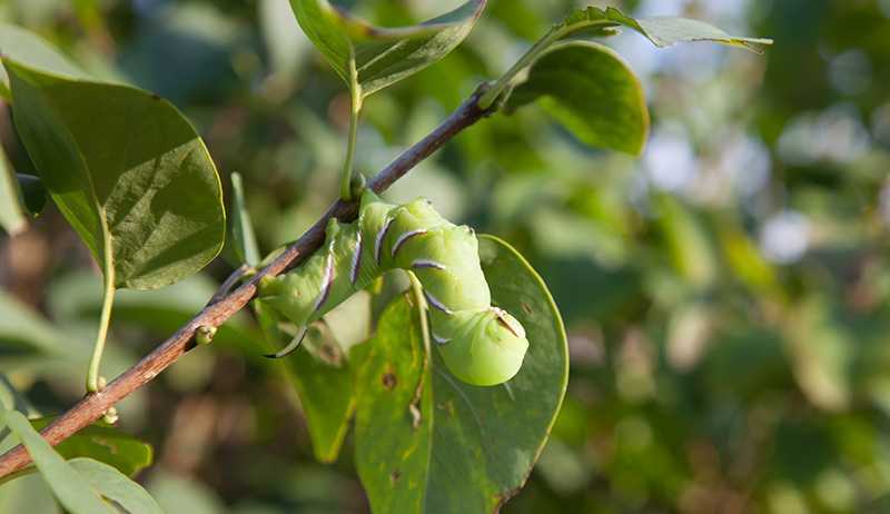 Havens grønne kæmpe kunne man også kalde ligustersværmerens larve. For med en længe på op til 100 mm kan den fine, lysegrønne larve med de hvide og lilla striber imponere de fleste. På bagenden har den et sort “horn”. Larven kan ikke stikke med hornet som egentlig er rimelig blød, men hornet kan virke skræmmende overfor eventuelle fjender. Til trods for sin størrelse er ligustersværmerlarven godt camoufleret. Som navnet hentyder finder man den gerne på liguster, men andre planter som snebær, syren, aks, gedeblad og spirea kan også bruges. Larven kan ses fra slut juli og nogle gange helt hen i oktober. Oftest forpupper den sig dog allerede i løbet af september nede i jorden. Her ligger den til næste forår.