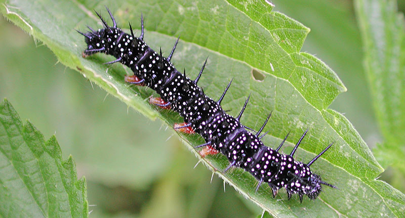 I haven har vi masser af dagpåfugleøjer og til trods for, at det er en af vores mest almindelige sommerfugle, synes jeg stadigvæk, at det også er en af vores smukkeste! Hvis man gerne vil have dagpåfugleøje i haven er det et must med nælder! Hos os har vi masser af nælder, men for at de er attraktive at lægge æg på, skal brændenælderne stå lyst. Det er iøvrigt ikke kun dagpåfugleøje, der lægger sine æg på nælder. Det gælder også for Nældens takvinge, Admiral, Det hvide C, Tidselsommerfugl og Nældesommerfugl. Dagpåfugleøjens larve er sort med små lyse pletter. Larverne er 38-42 mm lange og lever mange sammen. Til at starte med i et stort fælles spind, men når de er omkring 10 mm skifter de plante. De er dog stadigvæk sociale, men spredes over et lidt større areal. Larverne har et forsvar hvis de bliver truet af en fjende. Helt simpelt så brækker de sig og udgyder en væske, der ikke er attraktiv. Dagpåfugleøjens larver finder man tidligt på sommeren og gerne i maj og juni. Larverne er også sjove at følge i et terrarium fra larve til sommerfugl. Du kan læse mere om det på Naturguide.dk her: Forvandling fra larve til sommerfugl.