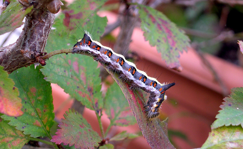 En af haven mere spektakulære larver er dueurtsværmerens larve. Aftensværmeren lægger gerne sine æg på planten dueurt (deraf navnet), men også gederams og havens fuchsia bliver benyttet. Her i haven har jeg et hjørne, hvor dueurten (Lådden dueurt) får lov til at stå, men flere steder i haven står også forskellige fuchsia. Så her er der flere steder, hvor dueurtsværmeren kan lægge sine æg.