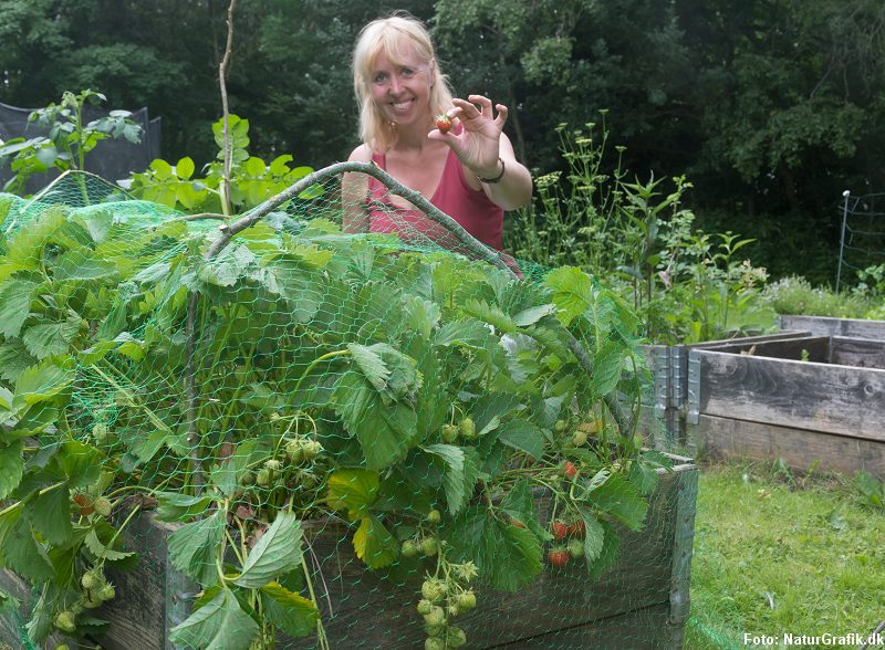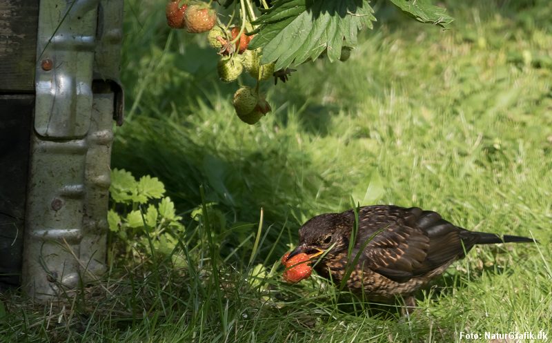 Jeg holder rigtig meget af havens solsorte, men jeg holder også meget af mine jordbær. Jeg deler gerne med fuglene – til en vis grad. I hvert fald indtil forleden, da jeg opdagede at et par store solsorteunger mere eller mindre har taget fast ophold i jordbærbedet. Den går ikke! Nu har jeg anskaffet mig et fuglenet, der her i højsommeren skal beskytte mine jordbær. Skrubtudsen og de store løbebiller bidrager med at holde sneglene på afstand. Ellers lukker jeg kortvarigt hønsene ind i haven – indtil de også får øje på jordbærrene.