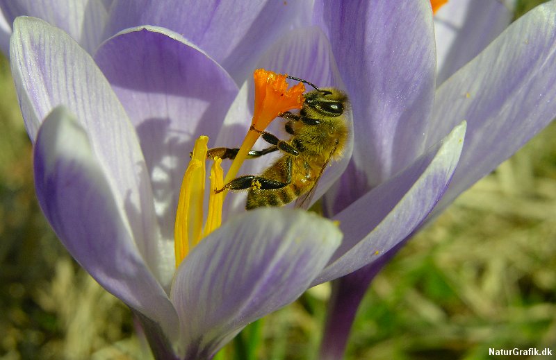 En tidlig honningbi tager godt imod havens krokus. Foto: Niels Lisborg/NaturGrafik.dk.