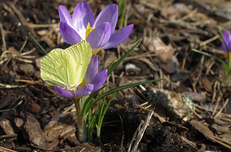 Citronsommerfuglen er en af årets tidligste sommerfugle, der dukker op allerede i marts. På dette tidspunkt er der ikke mange blomster. Her har sommerfuglen fundet havens krokus. Foto: Svetlana Klaise/Dreamstime.com.