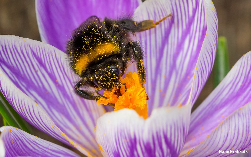 En humlebi er næsten dækket af pollen fra krokus som den gladeligt besøger i det tidligere forår. Foto: Niels Lisborg/NaturGrafik.dk.