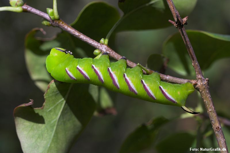 Senere – hen i højsommeren og det tidlige efterår, ses ligustersværmerens enorme larve, der virker helt tropisk. Læs mere om kæmpelarven på NaturGuide.dk.