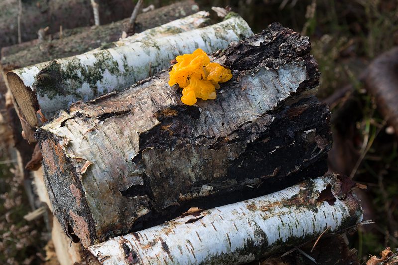 Gul “vingummi-svamp” lyser op på brændestakken. Det er gul bævresvamp – en af de svampe, der kan opleves hele året.